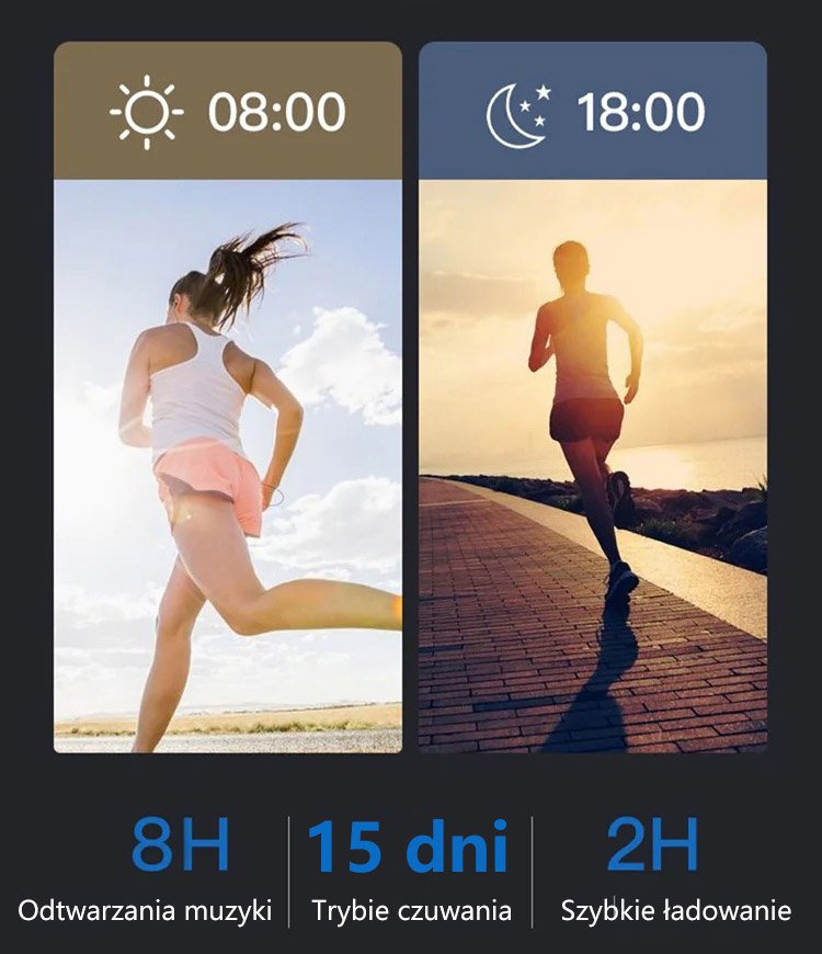 Akumulator zapewnia ponad 7–8 godzin odtwarzania muzyki i 15 dni w trybie czuwania.