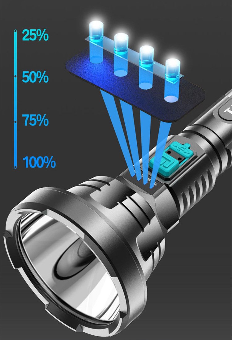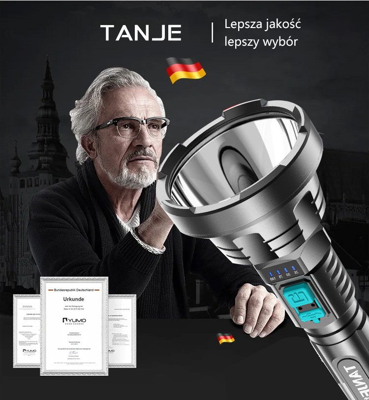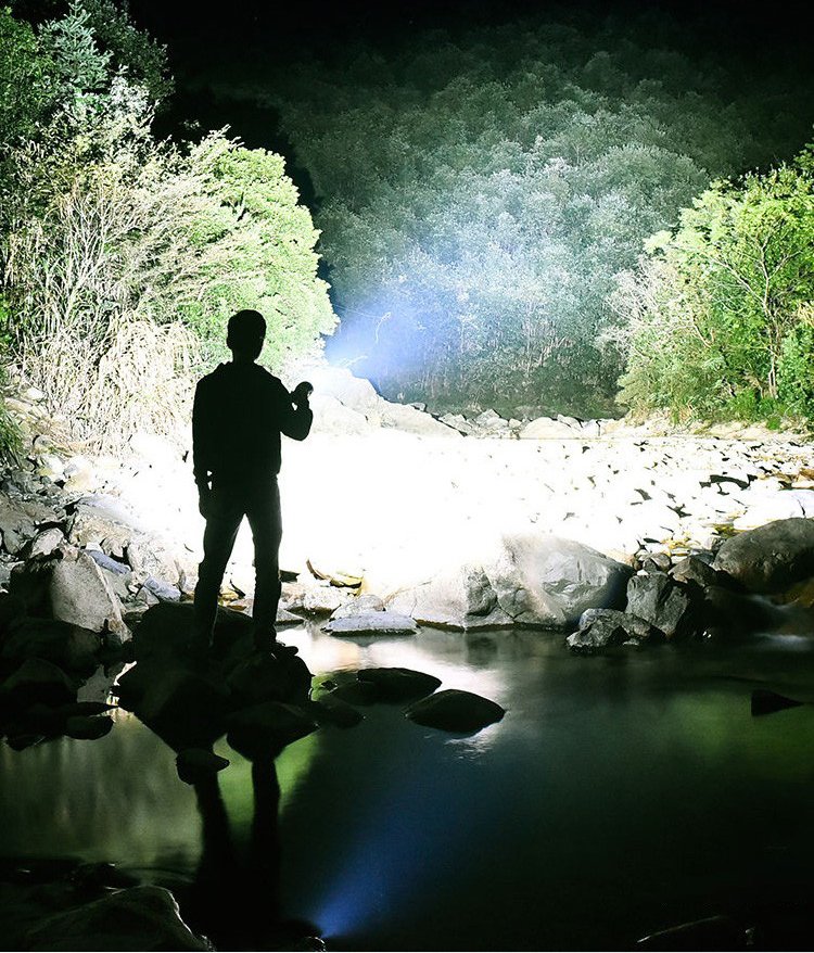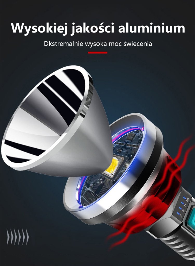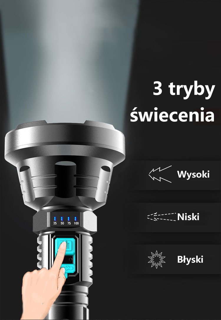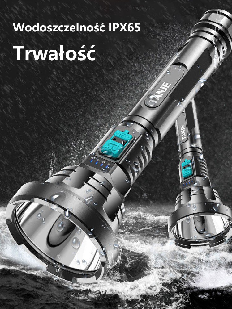 Wysokowydajna i bardzo jasna latarka / reflektor, 5000 lumenów, czas pracy do 40 godzin i zasięg 4999 m w przypadku światła na najwyższym poziomie mocy.