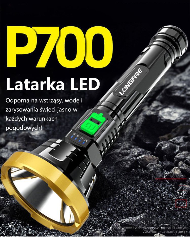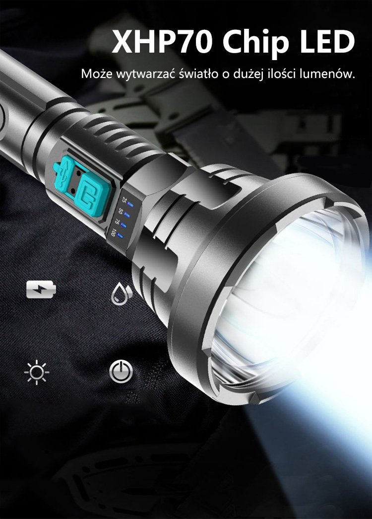 Ta super jasna latarka wykorzystuje chip XPH700 LED najnowszej generacji o żywotności 100 000 godzin.